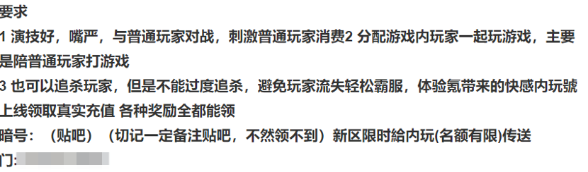 但是,壹娱观察(ID:yiyuguancha)加上招聘人员QQ,深入交谈之后,对方却发给了另一份招聘要求——要求演技好,嘴严(对不起辜负了您的期望),在游戏中可以追杀玩家,但不可以过度追杀,避免玩家流失,最重要一点,“要让玩家体验氪金带来的快感”。