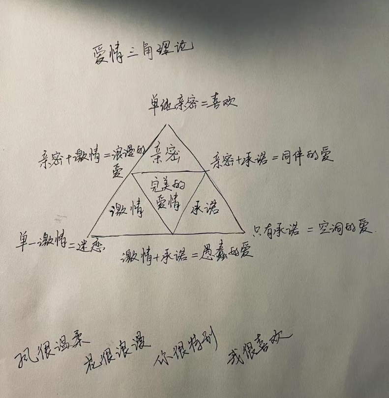 “完美的爱情由三个成分构成——激情、亲密和承诺。单纯亲密=喜欢,亲密+承诺=同伴的爱,只有承诺=空洞的爱,激情+承诺=愚蠢的爱,单一激情=迷恋,亲密+激情=浪漫的爱。”