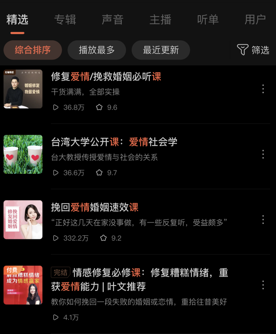 除了沈奕斐的恋爱课,喜马拉雅平台遍布着各类“恋爱课”。从“修复爱情”到“拯救婚姻”,每门课程都有着上万的播放量。
