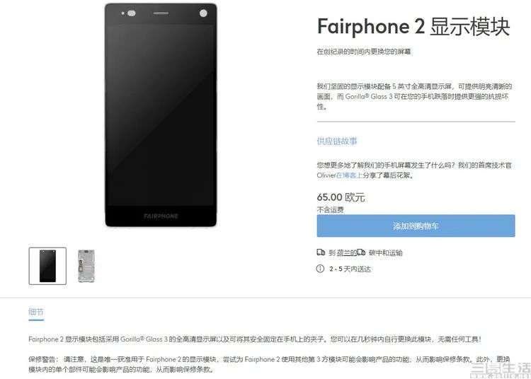 与此同时,查询FairPhone官网不难发现,这款老机型所使用的LCD屏幕总成,目前依然标价高达65欧元(约合468元人民币)。这是什么概念呢?要知道,如今在主流电商网站中,一款三年前发布的老款旗舰机型所使用的1080P LCD屏幕总成,价格通常也不过就在200多元。相比之下,FairPhone的“官方维修备件”技术规格更老、价格却贵了一倍。