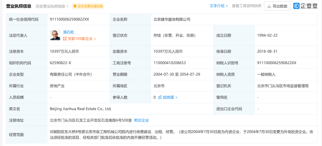 据爱企查显示,建华置地成立于1994年2月,注册资本10397万人民币,法定代表人为潘石屹,企业类型为有限责任公司(中外合作),经营范围包括对朝阳区东大桥8号原北京市政工程机械公司院内进行房屋建设、出租、经营等。
