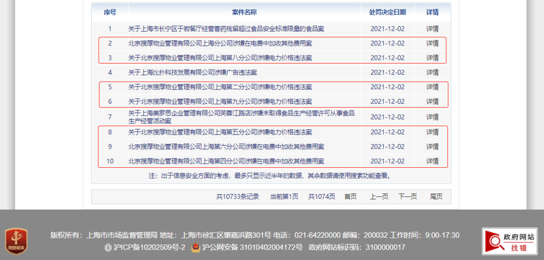 据行政处罚决定书内容显示,北京搜厚物业管理有限公司上海分公司、上海第二分公司、上海第四分公司、上海第五分公司、上海第六分公司、上海第八分公司、上海第九分公司均涉嫌在负责终端用户的电费代收代缴过程中存在加价多收电费行为。