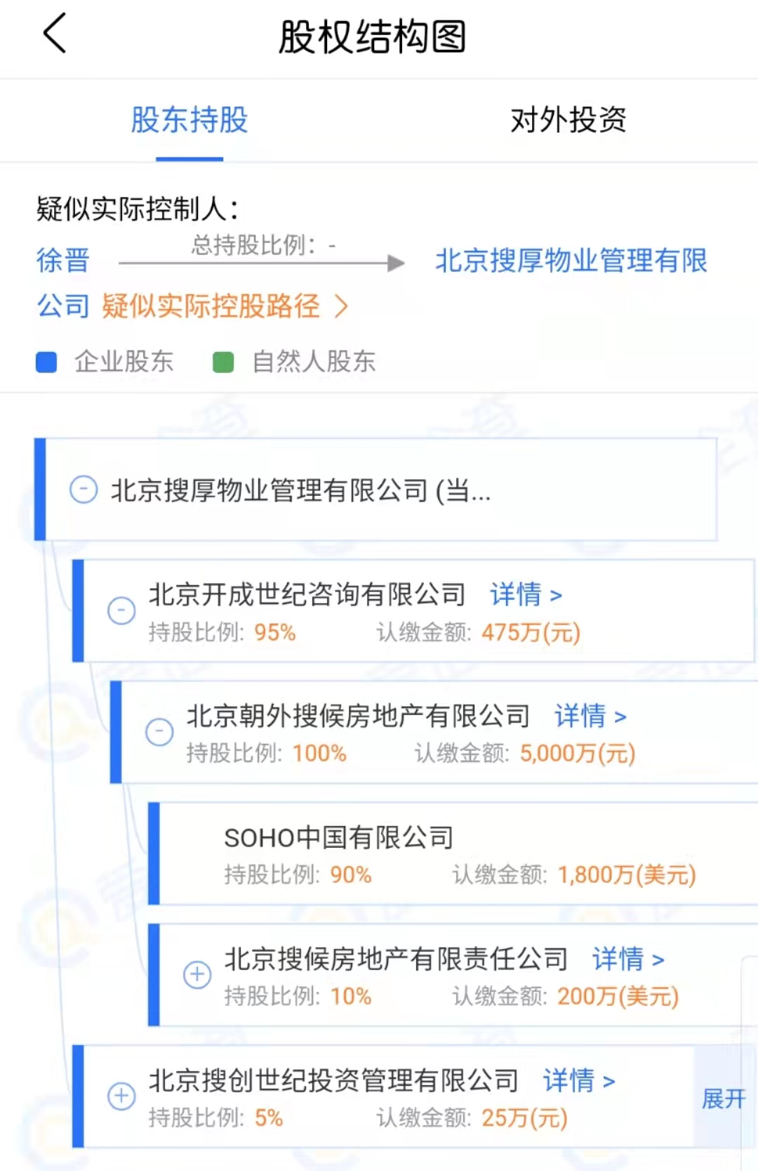通过股权穿透可以发现,北京开成世纪咨询有限公司为北京朝外搜候房地产有限公司全资子公司,后者大股东为SOHO中国有限公司,持股比例90%;另外10%由北京搜候房地产有限责任公司持有。