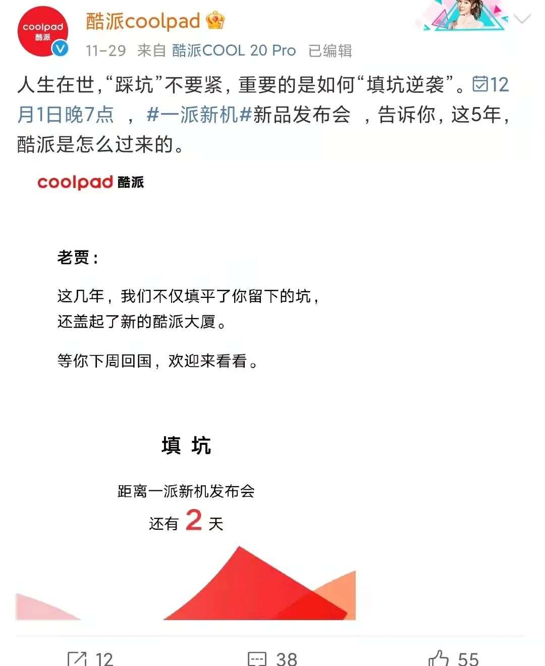 11月29日,酷派发微博称:“人生在世,踩坑不要紧,重要的是如何填坑逆袭。” 酷派隔岸向贾跃亭“喊话”道:“老贾,这几年,我们不仅填平了你留下的坑,还盖起了新的酷派大厦。等你下周回国,欢迎来看看。”