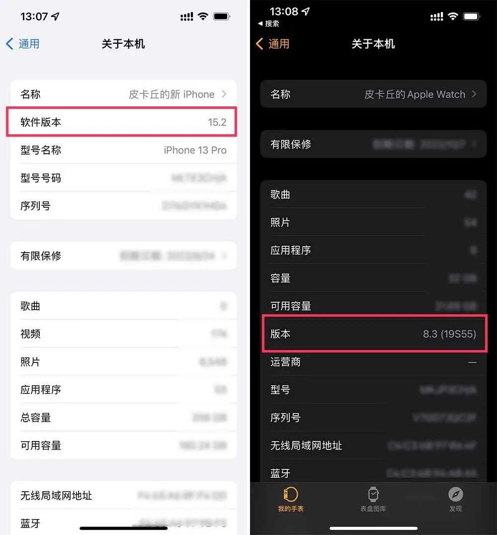 ▲左为 iPhone 系统版本,右为 Apple Watch 系统版本.