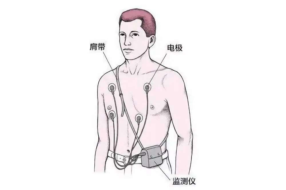 ▲动态心电图又称 Holter 监测,监测仪通过肩带被固定到被检查者的身体上。通过贴在胸壁上的电极,监测仪可持续记录被检查者心脏的电活动.