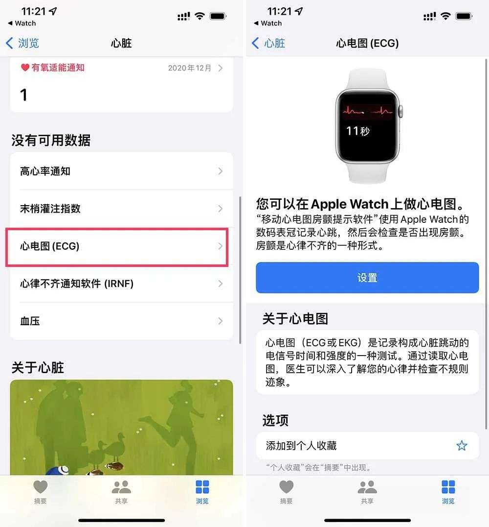 设置心电图功能非常简单,首先要进入《健康》app,选择「心脏>心电图(ECG)」,来到心电图(ECG)的设置界面。