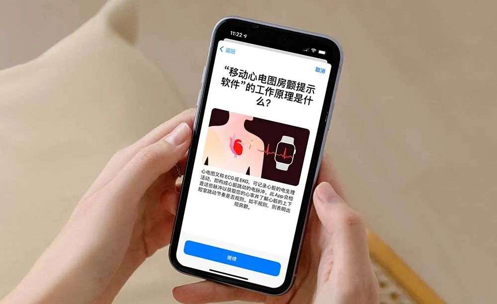 在心电图功能的设置引导中,清楚的写明了 Apple Watch 绘测心电图的工作原理:此 app 会检查心脏跳动的电脉冲,以获取心率并了解心脏的上下腔室跳动节奏是否规则。如不规则,则表明出现房颤。