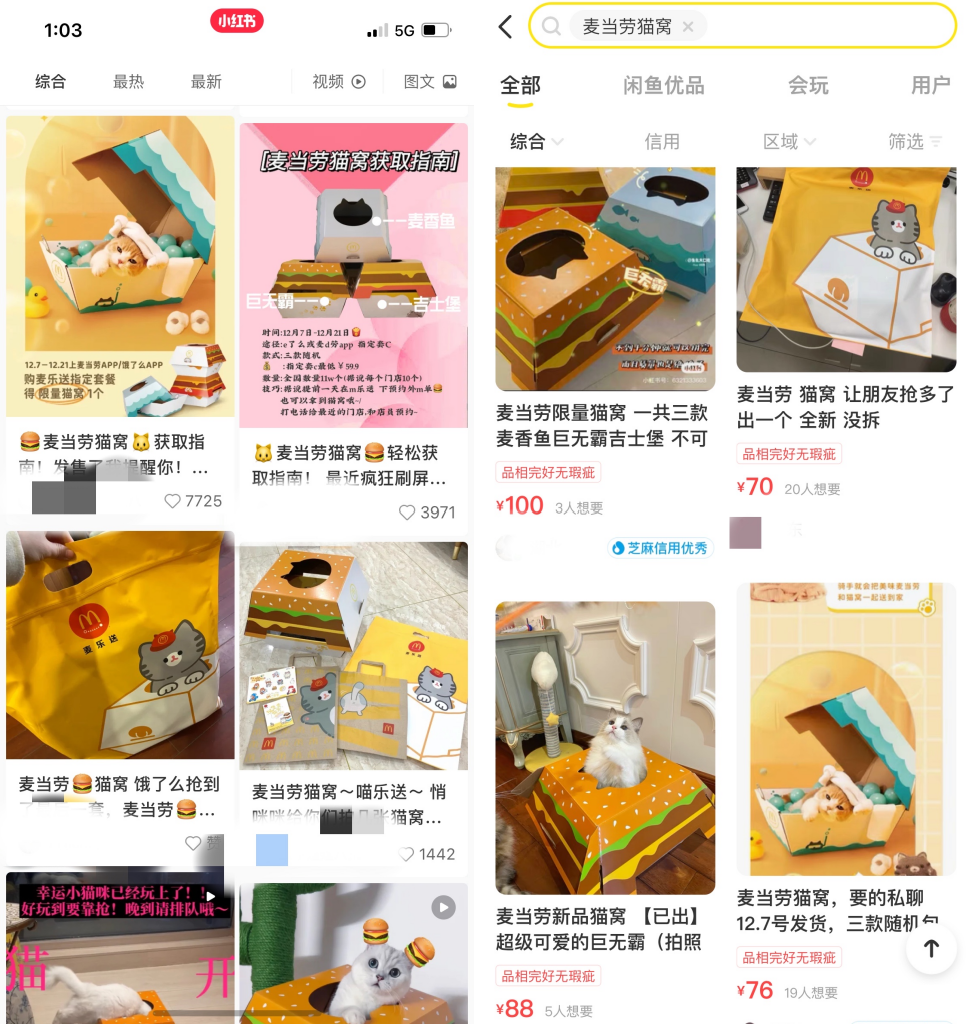 虽然在正式发售之前,据说麦当劳找了一些KOL博主做测评试用,但就在上线当日,麦当劳猫窝在小红书的笔记就已经有3500多篇,而且大部分都是网友们的晒图,还有刚上线没多久,闲鱼也有高价出售的了。