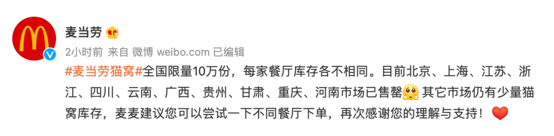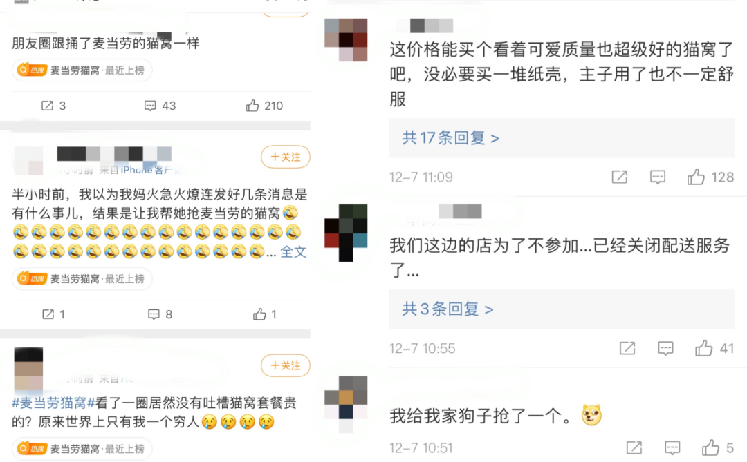 据了解,麦当劳“汉堡”猫窝是12月7日正式上线,也就是昨天,全国限定一共有10万份。上线没多久后,大部分城市都已经售罄了。