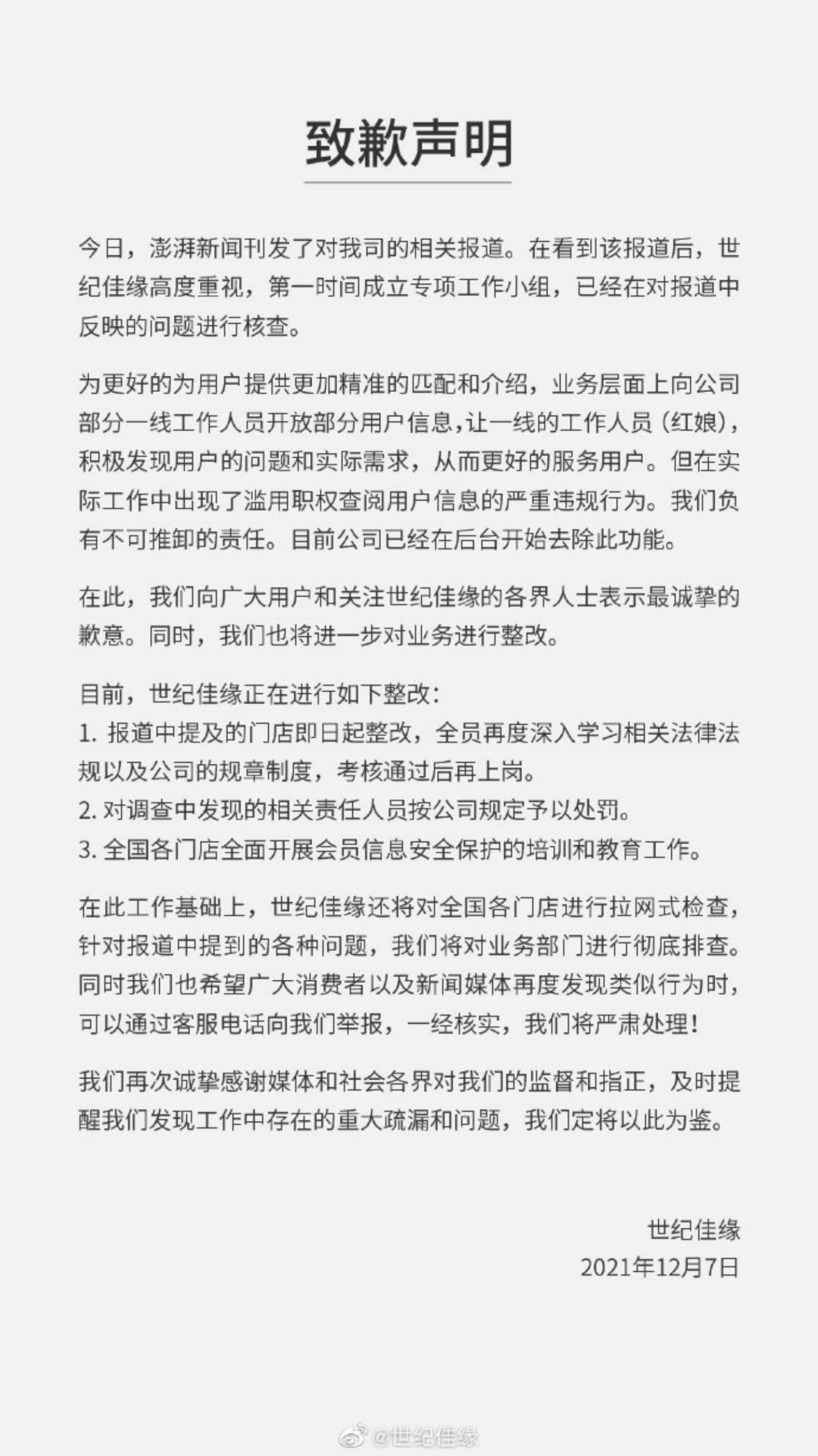 对此,世纪佳缘官方微博发布致歉声明,称实际工作中出现了滥用职权查阅用户信息的严重违规行为,目前公司已经在后台开始去除此功能。报道中提及的门店即日起整改,全员考核通过后再上岗。相关责任人员按规定予以处罚。全国各门店全面开展会员信息安全保护的培训和教育工作。
