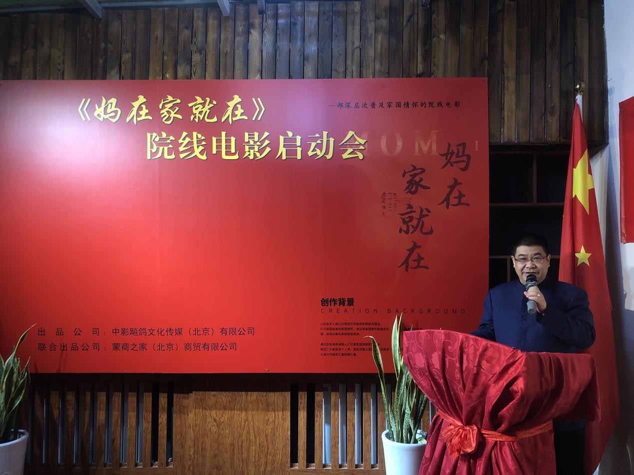 2021年12月5号10点38分,《妈在家就在》院线电影由中影飚鸽文化传媒(北京)有限公司出品,蒙商之家(北京)商贸发展有限公司联合出品,《妈在家就在》启动会圆满成功举办。著名导演王帅与国家一级表演绎艺术家丁汝骏先生,编剧孙晓静女士,以及著名主持人王为念老师,八一电影制片厂故事片导演、演播艺术家吴俊全老师,著名特型演员卢奇老师,著名相声表演艺术家张大礼先生,著名古彩戏法非遗传承人、中国近景魔术第一人辛刚老师,世界著名马头琴大师齐宝力高大弟子伊拉图老师,内蒙古资深媒体人邸和平,蒙商之家董事长刘海玮、总经理张万东,世家收藏,年轻鉴赏家,北山藏舍主人韩波先生,中影飚鸽文化传媒(北京)有限公司董事长王文琦、高级顾问王章英、总经理李梦楚、董事杨军军先生等30多位嘉宾在签名墙上签下自己的名字。记者从发布会上获悉,该院线电影将于2022年10月全国公映。