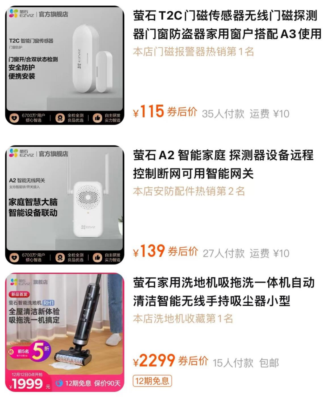 图源:萤石官方旗舰店——门窗传感器(35人付款)、无线网关(27人付款)、洗地机(15人付款)