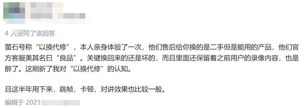同样在今年4月,一位消费者在社交平台表示,自己“以换代修”后收到萤石网络的“新产品”疑似存在质量问题,并且设备内保留有上一位用户摄录的相关视频数据。