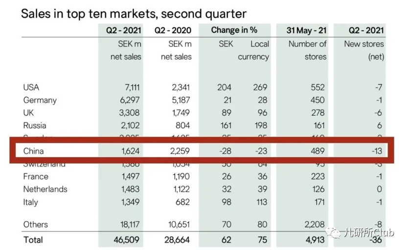 2021年二季度财报显示,中国内地市场在H&M全球市场中排名仅居第六。然而在今年一季度,中国内地市场是H&M集团仅次于美国和德国的第三大市场,占该公司销售额约6%,也是H&M在疫情期间销售额唯一增长的主要市场。2020财年时,中国内地销售总额还是H&M集团全球前四大市场之一,占比达5.2%。