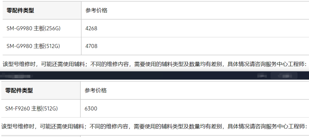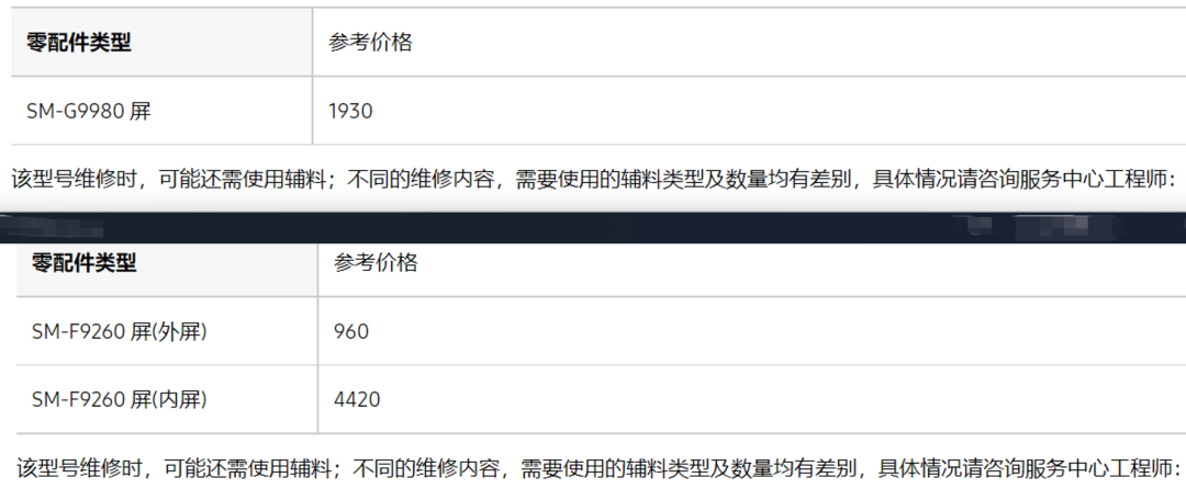 为了进一步直观地了解当今折叠屏手机的成本情况,我通过三星、华为的官方售后渠道查询到了三星最新折叠屏手机Galaxy Z Fold3的零部件维修价格和华为Mate X2折叠屏手机的零部件维修价格。