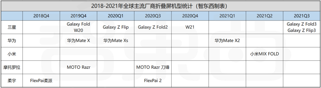 ▲2018-2021年全球主流手机厂商折叠屏机型统计,根据公开信息整理