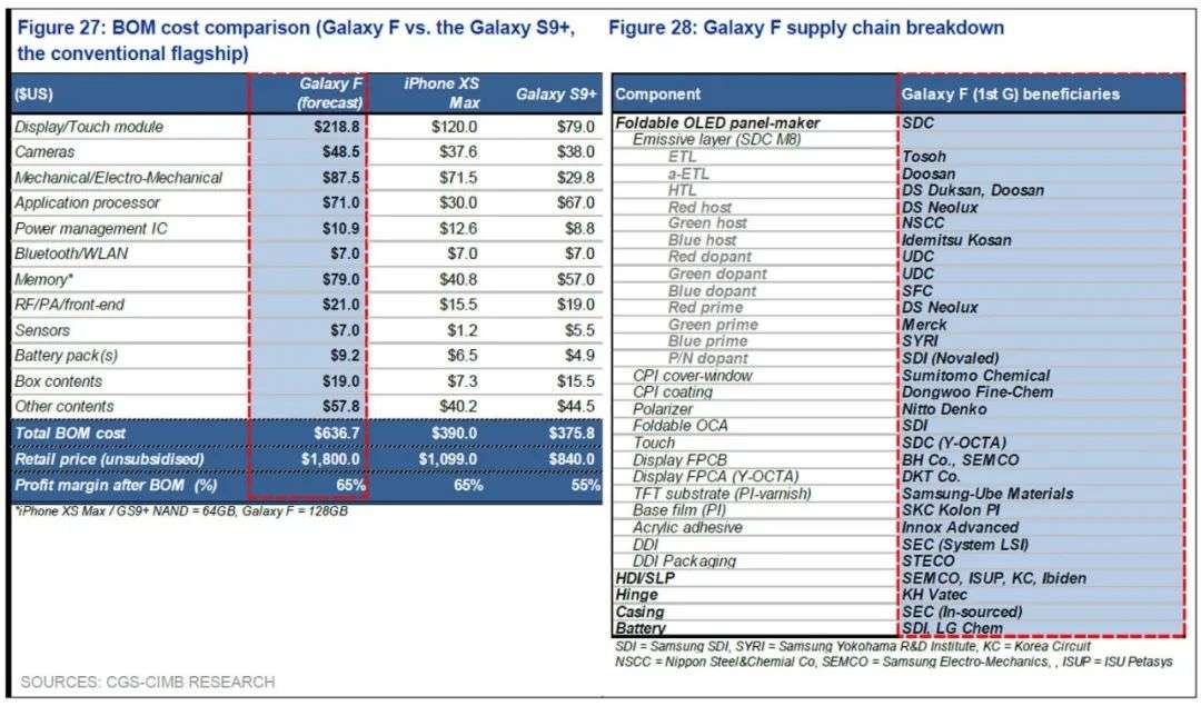 时间向前推进,我找到了一份疑似三星初代折叠屏手机Galaxy Z Fold与iPhone XS Max、Galaxy S9+的物料成本对比报告。