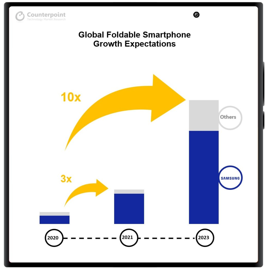根据Counterpoint预测,2021年折叠屏手机市场出货量相比2020年翻了三倍, 而到2023年,折叠屏手机市场出货量将再次翻三倍以上,达到约3000万部的规模。