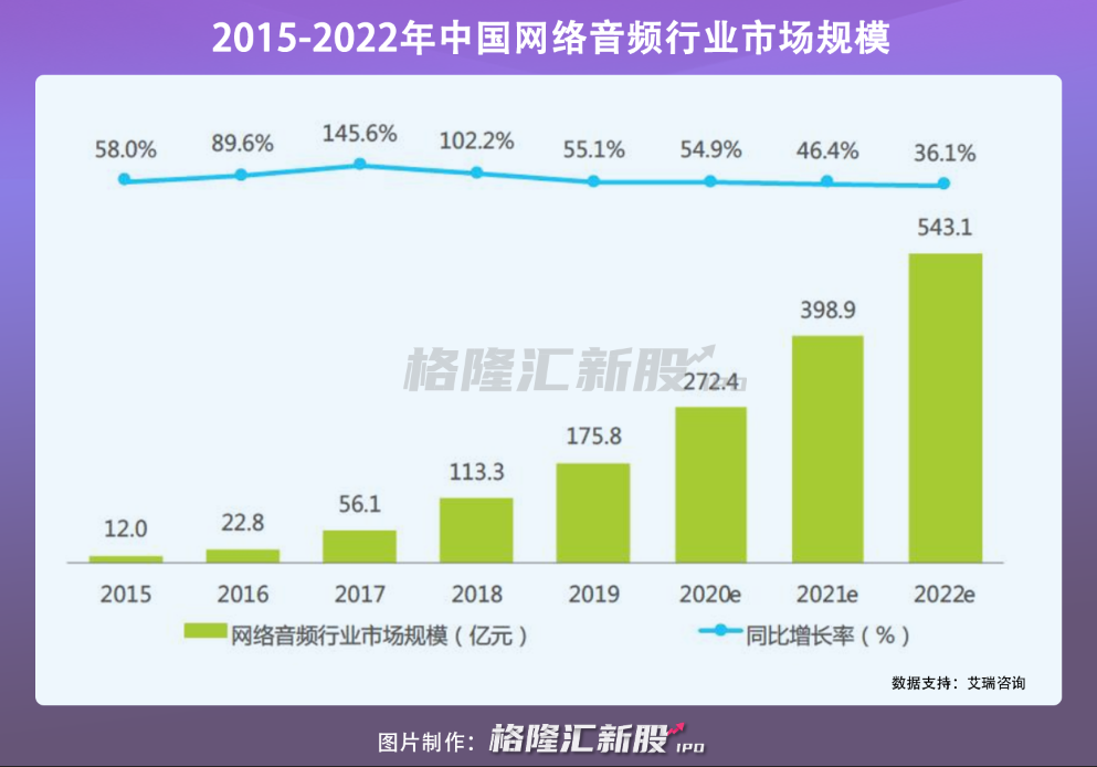 2019年,中国网络音频行业市场规模为175.8亿元,同比增长55.1%,预计到2022年,该规模将增至543.1亿元。