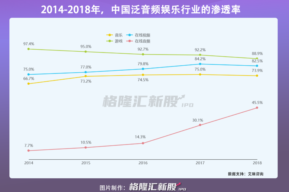 然而截至2018年,当音乐、游戏、在线视频的移动互联网用户渗透率已分别达到88.9%、82.5%、73.9%时,在线音频市场的渗透率仅为45.5%,在移动互联网红利渐接天花板的今天,在线音频成为仅存不多的还有较大渗透空间的赛道。
