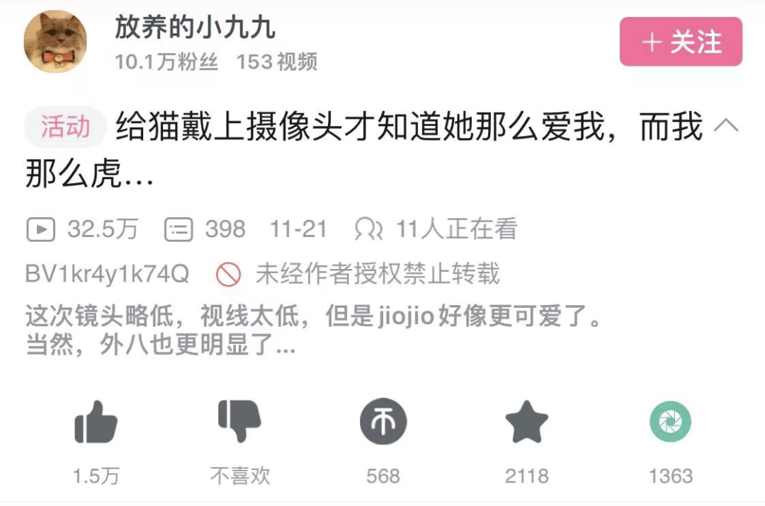 在B站的茫茫萌宠视频里,UP主@放养的小九九 的猫咪视频别具特色。