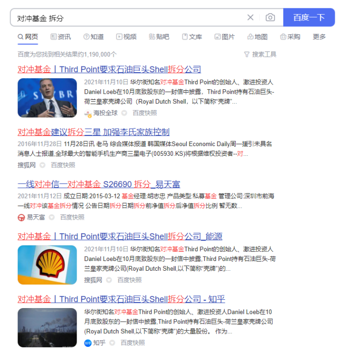 在百度搜索输入关键词“对冲基金+拆分”的结果