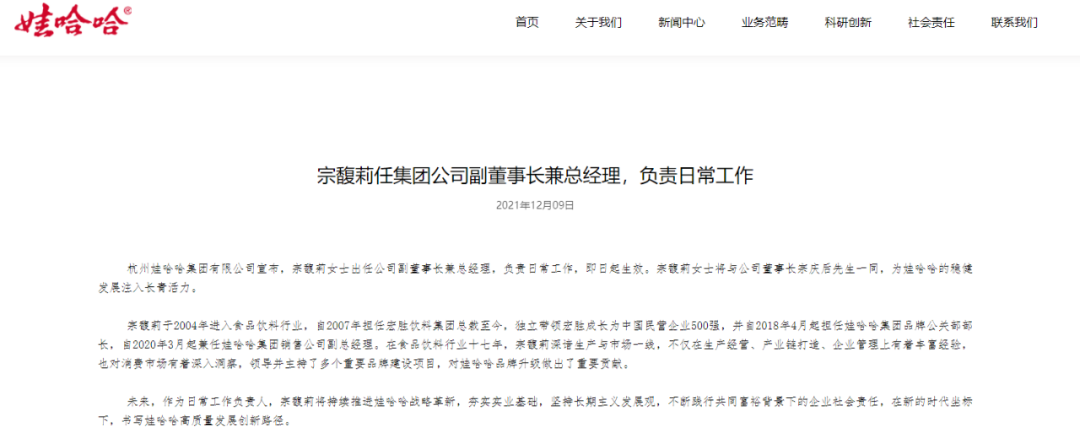 12月9日,娃哈哈集团在官网发布新闻,宣布宗馥莉出任集团副董事长兼总经理,负责日常工作,“与宗庆后一同,为娃哈哈的稳健发展注入长青活力”。其父宗庆后仍为集团董事长。