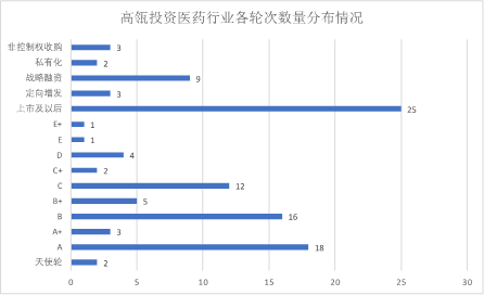 聚焦占比最大的医药行业,投资事件在上市以后发生次数最多为25起,其次是A轮投资发生18起,B轮投资发生16起。其中,抗肿瘤药物研发商占比最多,有8家,药物研发生产服务供应商和抗体新药研发商分别有4家,紧随其后的是创新药研发商和制造商,投资总额均超百亿。