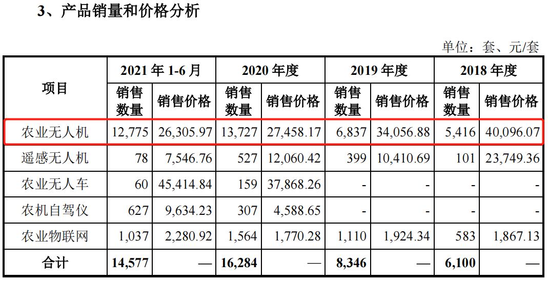 招股书显示,极飞科技的“拳头”产品农业无人机的售价由2018年的4.01万元/套降至2021年上半年的2.63万元/套。