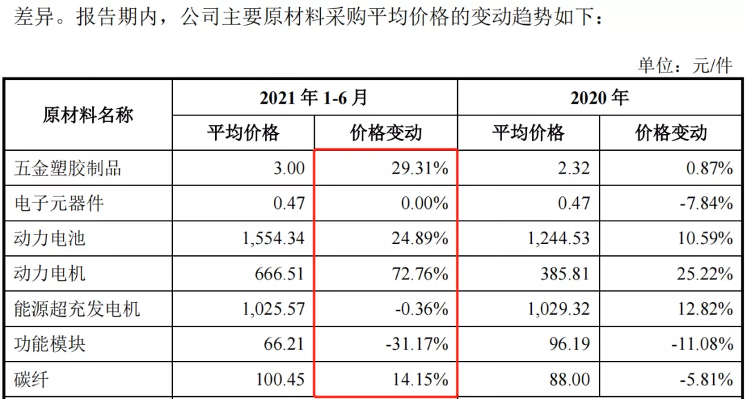 招股书显示,2021年上半年,动力电池平均价格为666.51元/件,同比增长72.76%;五金塑料制品平均价格为3元/件,同比上涨29.31%;动力电池均价同比上涨24.89%,至1554.34元/件。