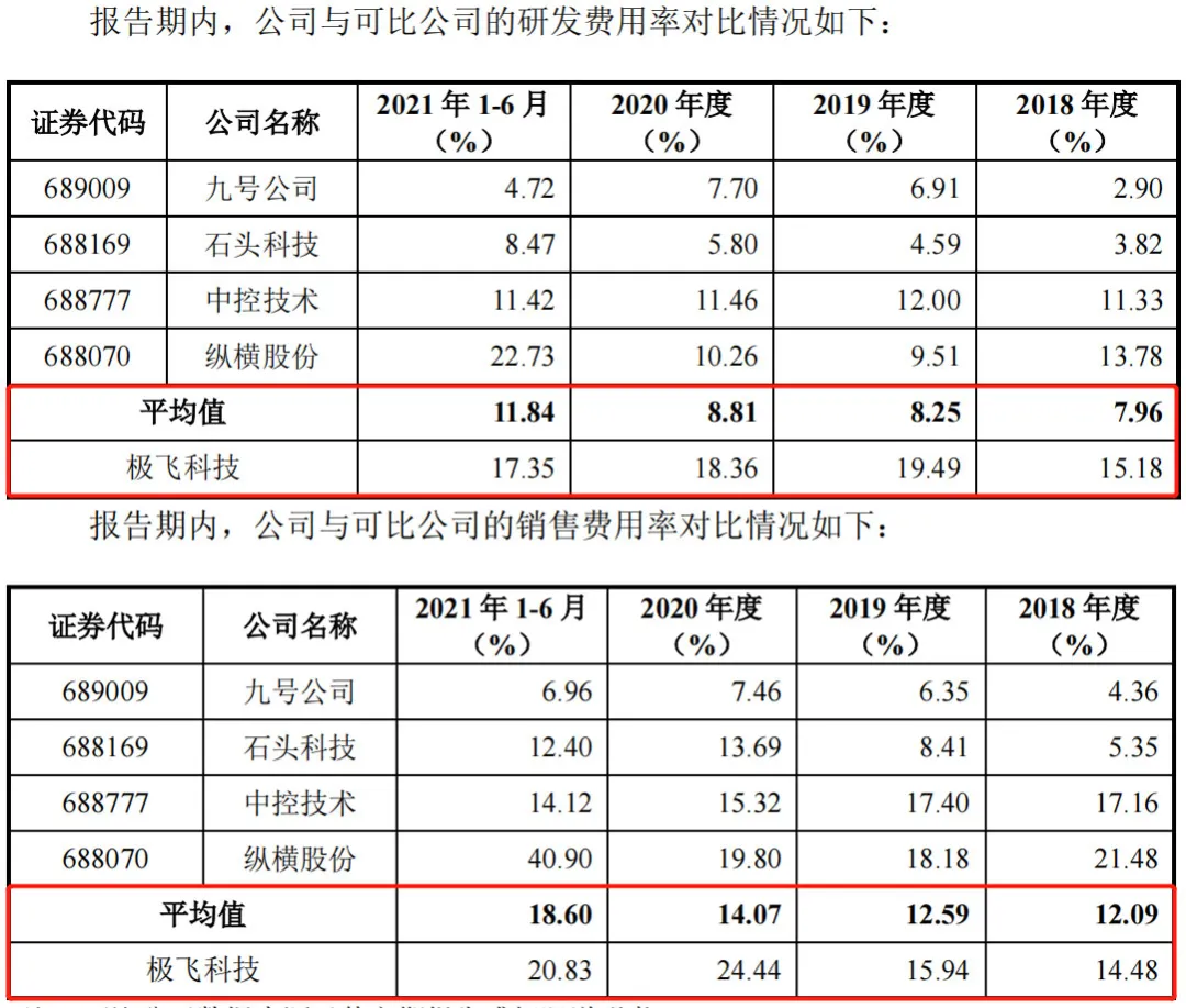 2018年-2020年,极飞科技的研发费用率分别为15.18%、19.49%、18.36%;销售费用率分别为14.48%、15.94%、24.44%。且均持续高于同业可比公司平均值。