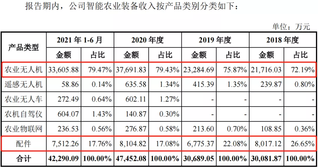 极飞科技的营收来源较为单一,几乎全部来自于农业无人机产品及配件,其中超7成收入来源于农业无人机产品。