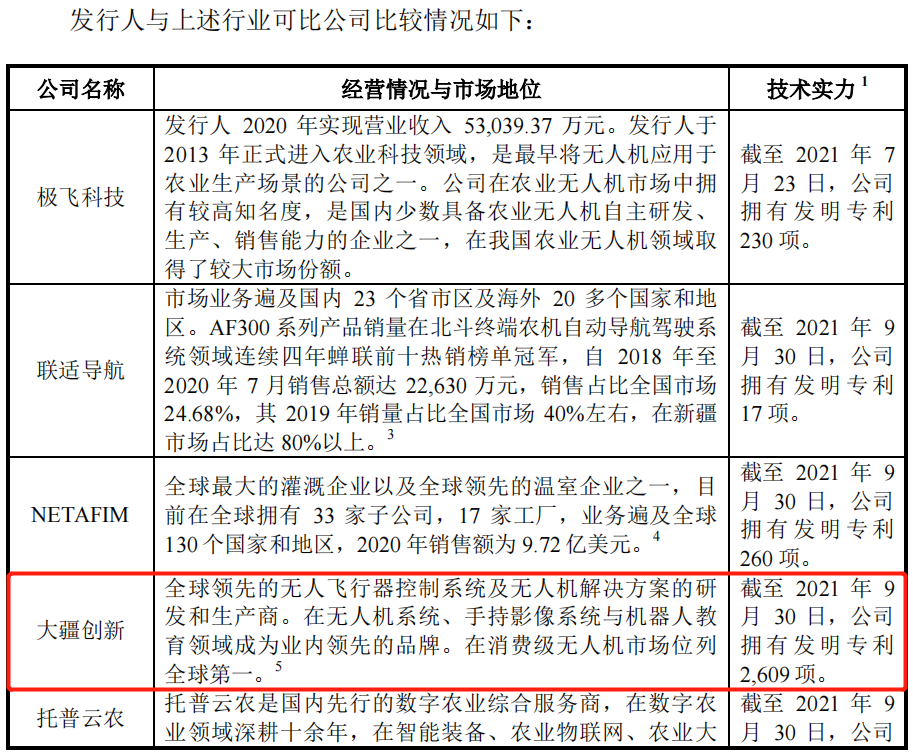 招股书显示,截至2021年9月30日,大疆已拥有的发明专利2609项。而与其相比,截至2021年7月23日,极飞科技拥有发明专利仅230项。
