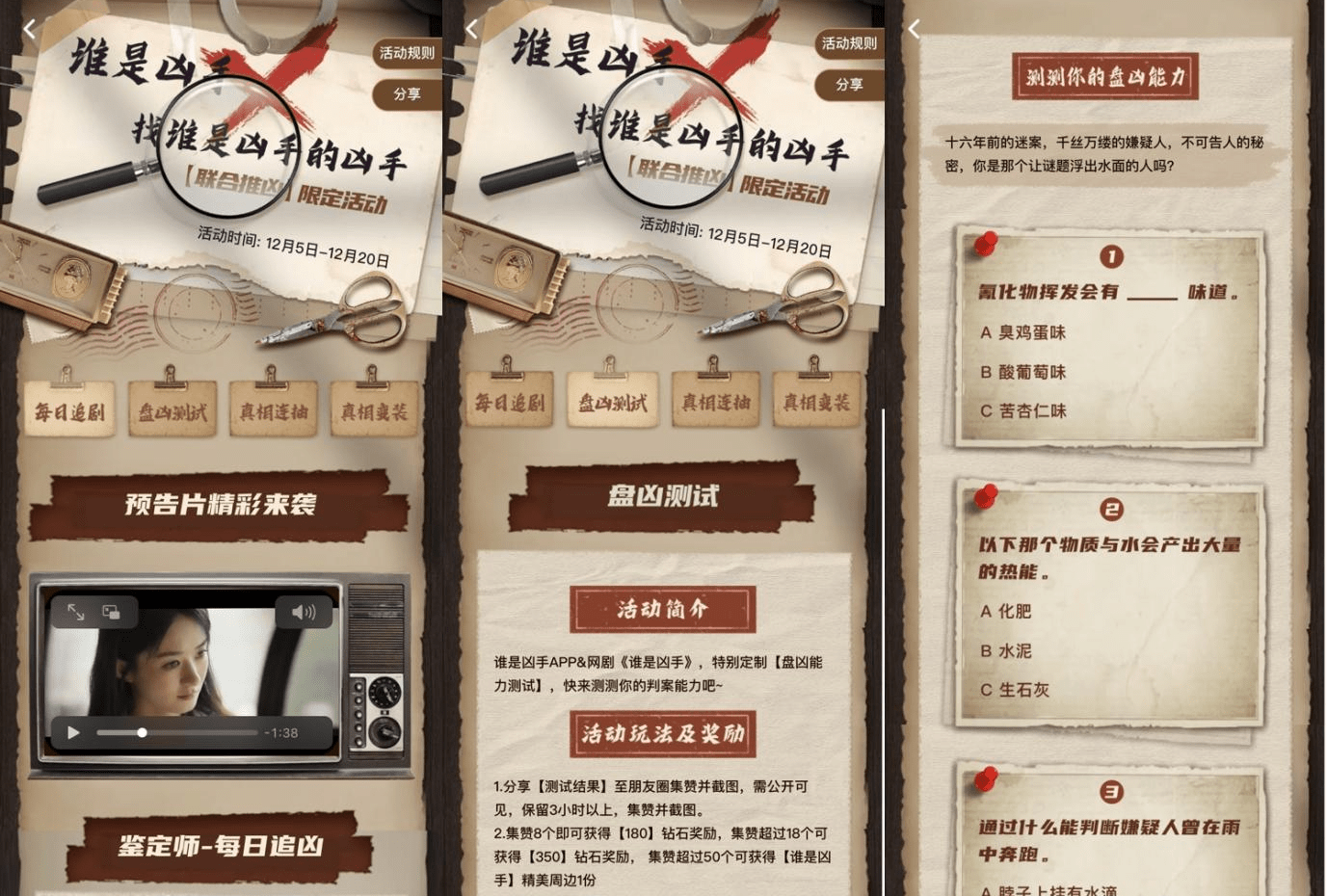 此次通过与爱奇艺迷雾剧场深度合作,借势热门网剧进行品牌推广,并创新网剧品牌营销新玩法。通过在app里开设同名网剧剧情讨论专题活动,设置了【每日追剧】、【盘凶测试】、【真相连抽】、【真相变装】等多重玩法,将追剧和推理游戏结合,并将推理游戏与语音派对结合吸引剧迷在线连麦参与剧情线索盘点。