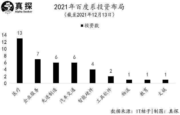 从具体投资领域来看,百度投资版图中有四分之一以上都是医疗企业,13家。百度还投了7家企业服务公司,6家先进制造和6家汽车交通。此外,百度的投资触角也伸到了智能硬件、工具软件、文娱、教育等领域。