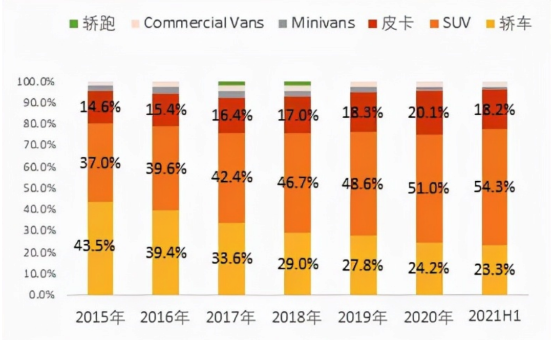 皮卡一直是美国消费者最爱的车型之一,2020年美国汽车销量分车型榜中,前三名福特F系、雪佛兰索罗德和道奇RAM全部是皮卡。J.D.Power研究公司分析师Jominy表示,近年来SUV和卡车一直在美国市场发展良好,两种车型占10月份美国汽车销售总量的80%左右。GCBC的数据也显示,皮卡在美国市占率持续稳定在20%左右,SUV则逐渐稳定在50%左右。