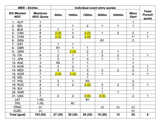 北京冬奥会速度滑冰男子项目席位分配情况。图/国际滑联官网