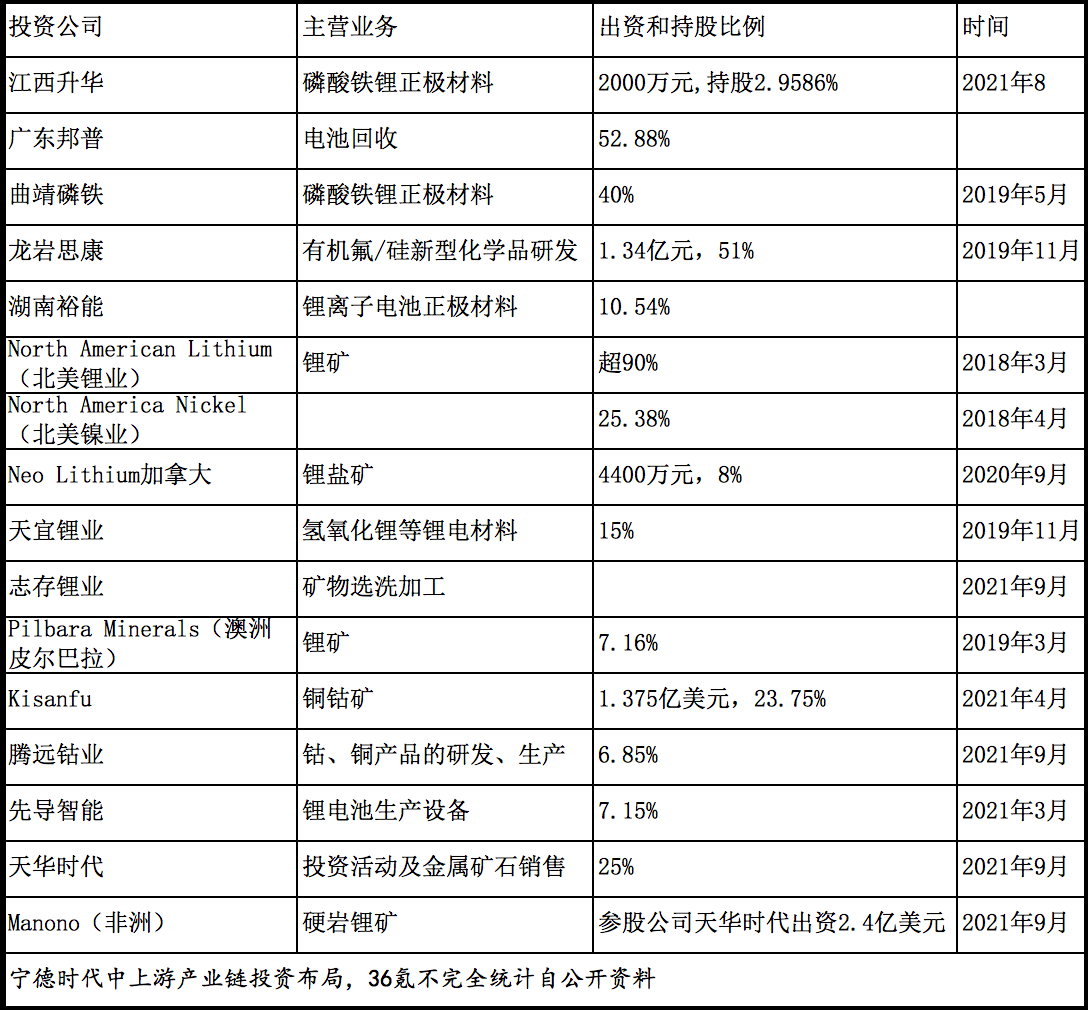 宁德时代中上游产业链投资布局,36氪不完全统计自公开资料