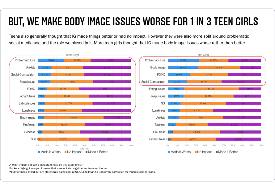 这次的丑闻焦点就是 Facebook对用户尤其是青少年用户的心理健康有着极大的负面影响 ,华尔街日报的报道公布了Facebook的内部调查,在英国有13.5%的青春期少女表示她们在开始用Instagram之后自杀的想法出现的更加频繁了,更有17%的青春期少女表示在开始用Instagram之后饮食障碍症更加严重了,32%的青少年女孩表示Instagram让她们对自己身材感觉更差了。
