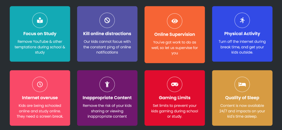 来自英国的iKydz更绝了,不仅是监测孩子的动态,而且让父母可以直接“上手”管制, 它所开发出的硬件和app技术能够让家长对孩子的电子设备有绝对控制权, 不管是在家还是在外,父母都可以随时监测孩子在电子设备上干什么,并可以选择在他们应该写作业的时候关闭社交媒体和视频网站的权限,还能设置雷打不动的玩游戏时长和固定的睡眠作息,也可以对某些成人内容网站设置拒绝访问权限…