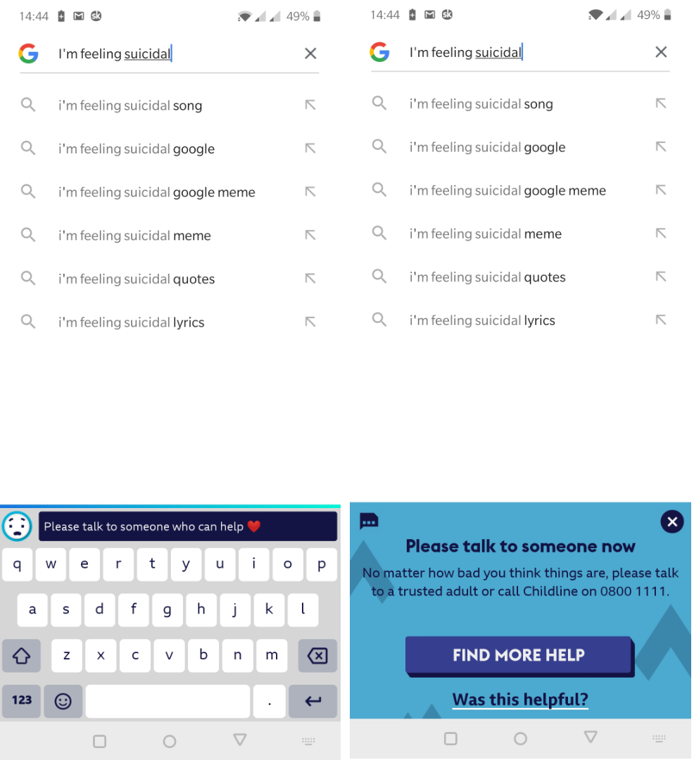 比如Privately就和BBC合作推出了一款叫做Own It的app,它的键盘自带机器学习技术,能够记录和分析年轻用户的文字和图片背后的情绪,当用户的行为出现异常或带有风险,系统就会自动跳出建议和支持方面的内容及时悬崖勒马,比如用户如果在搜索“我有自杀的念头…”那么系统就会建议“你想和别人聊聊这一想法吗?”并且还会显示可以帮助的热线电话号码。