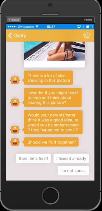 瑞士的初创公司Privately也在使用AI做类似的事情,它第一款面向消费者的产品叫做Oyoty,可以与Facebook和Instagram等软件相连,实时分析危险性帖子和对话并及时干预,比如用户想要发裸露照片或分享地址等个人信息时,系统会提示他们再考虑一下要不要这样做。