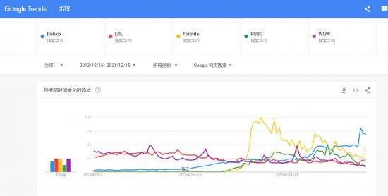 《螳螂观察》选取了全球最热门的5款游戏关键词,分别是Roblox(《罗布乐思》)、LOL(《英雄联盟》)、Fortnite(《堡垒之夜》)、PUBG(《绝地求生》)、WOW(《魔兽世界》),进行了过去9年全球范围内的搜索趋势对比。