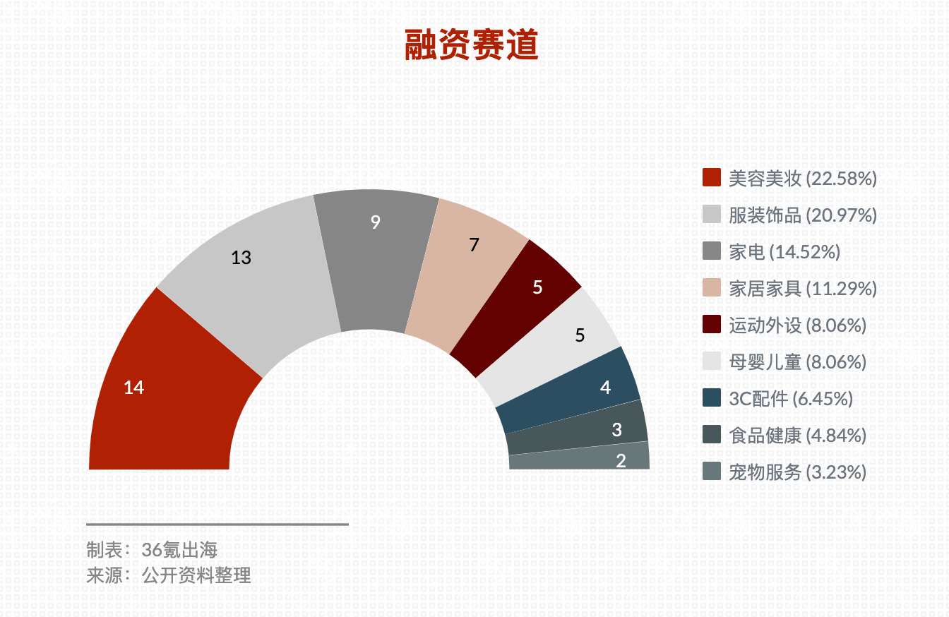 从赛道来看,本文涉及的项目中,美容美妆投融资最为火热,融资项目共14起,占比约23%;其次为服装饰品,共计13起融资,占比约21%。其余为家电9起、家居家具7起、运动外设5起、母婴儿童5起、3C配件4起、食品健康3起、宠物服务2起。