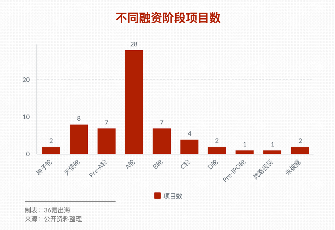 从融资阶段来看,上表涉及的大部分项目集中在A轮阶段,共28起,接近半数。中后期融资项目数量较少,A轮之后融资项目数极速下降,C 轮及 D 轮融资据不完全统计仅6起,且其中3起融资均被 PatPat 收入囊中。这在一定程度上说明,D2C 的商业模式在出海赛道获得了初步验证,但大部分项目的盈利能力或许还尚显不足。
