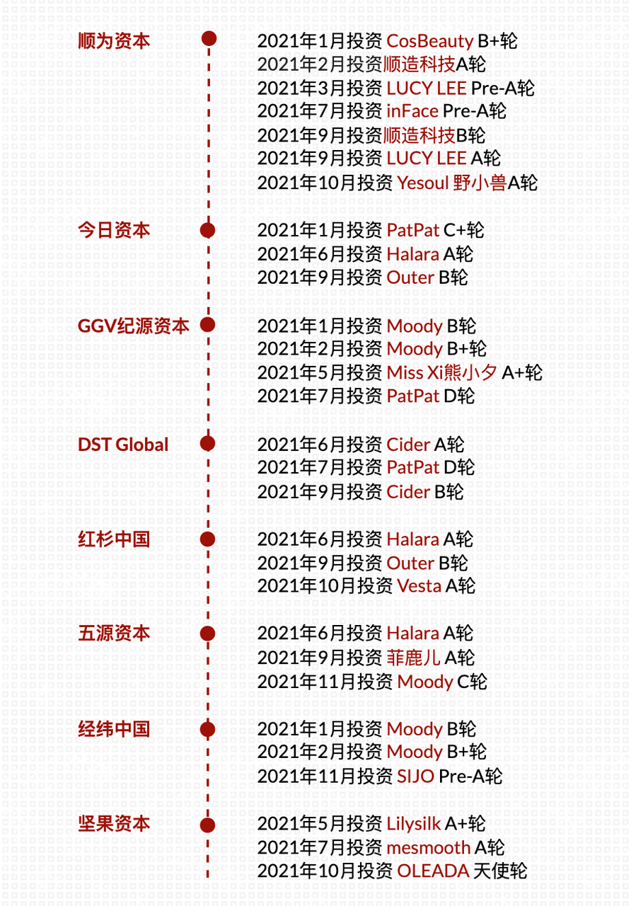 入局的知名投资方不在少数。先有软银1.6亿美元独家投资母婴品牌 PatPat,后有 a16z 入手快时尚品牌 Cider。互联网巨头没有落后,今年6月,字节跳动关联公司量子跃动完成对服装品牌心潮无限的战略投资;在家电个护赛道,小米集团及顺为资本入手包括 LUCY LEE、CosBeauty、顺造科技等在内的多个项目。