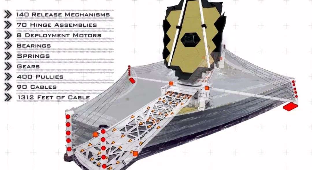 韦伯望远镜的庞大遮阳板组件上有140个释放机构,约70个铰链组件,8个部署电机,大量的轴承、弹簧和齿轮,约400个滑轮,以及总长1312英尺的90条电缆。