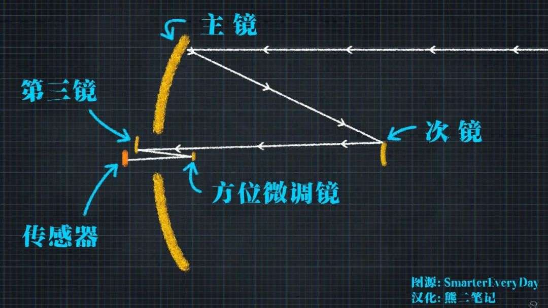 第一块主镜 需要足够大,像水桶一样把来自宇宙的尽可能多的光收集起来并汇聚到一块很小的 二级镜面 上。所有的光会经过 三级镜面 的反射到最后的 微调镜 上。这块微调镜会补偿航天器移动带来的误差,其功能可以理解为相机的稳定器。 经过这一系列光学组件后,光就到了最后成像之处了↓