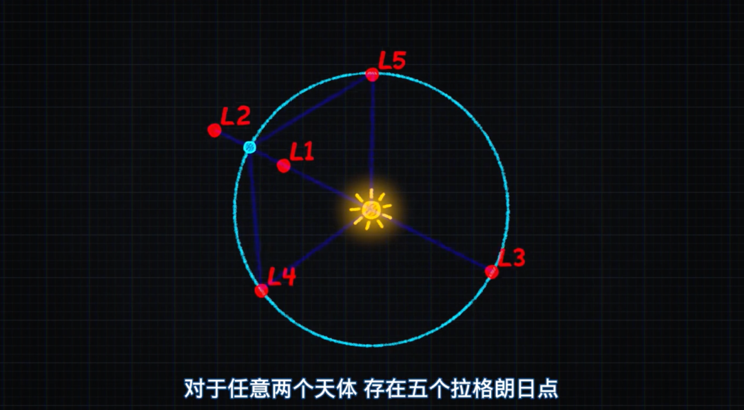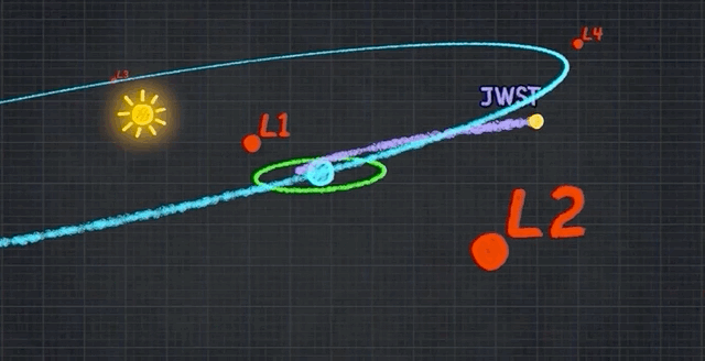 根据天体力学解释,任何“双星系统”都有五个拉格朗日点。除了两个点之外,另三个的拉格朗日点不很稳定,位于其他拉格朗日点上的小天体,稍受扰动就会离开它位置。由于韦伯望远镜还会被地球月球反射的热量所影响,所以第二拉格朗日点(下图的L2)是最理想的位置。